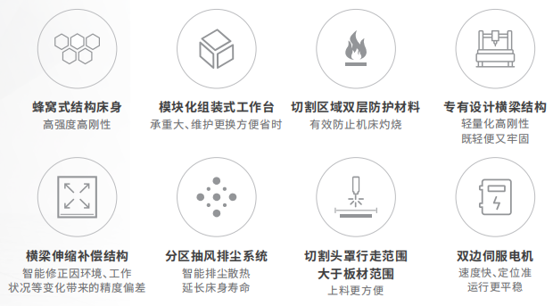 4. 具備掃碼導圖、圖形自動優(yōu)化 、高速尋邊、自動調焦、測焦、閃電穿孔、穿孔除渣、蛙跳切割、飛行切割、空移避讓、氣體沖刷、起刀收刀工藝、斷點續(xù)切、氣壓閉環(huán)、吹氣保護、高速尋邊、振動抑制自適應等功能,還可根據需求配備視覺余料再生產、自動更換噴嘴、平面坡口等高階功能。